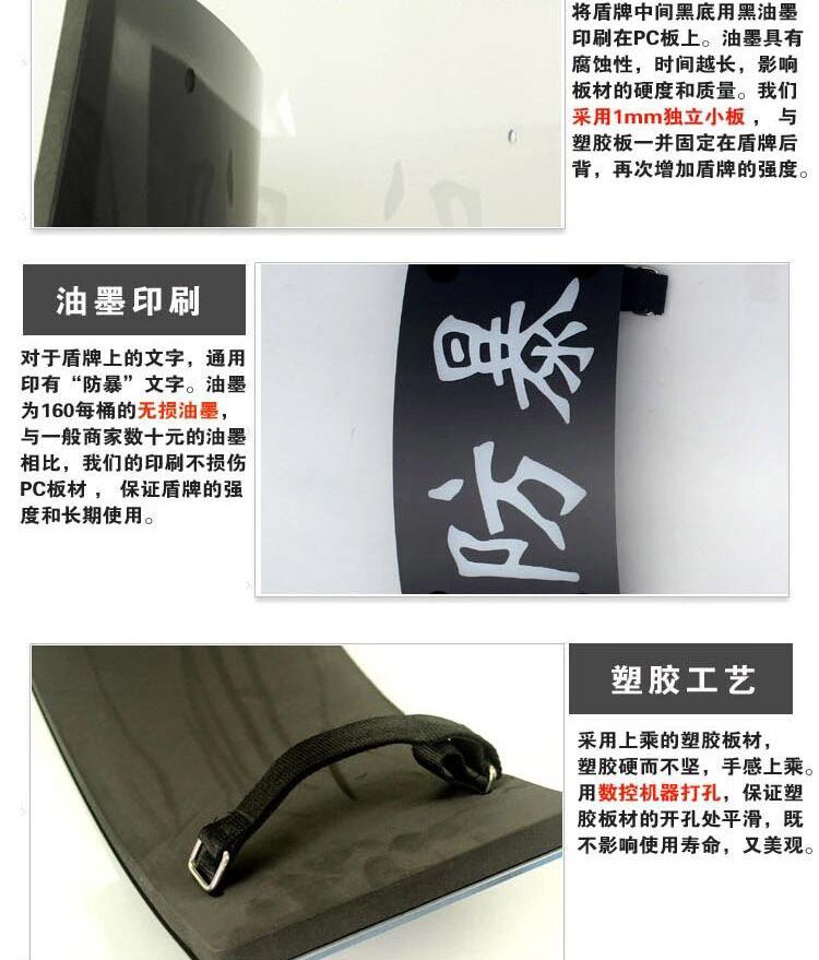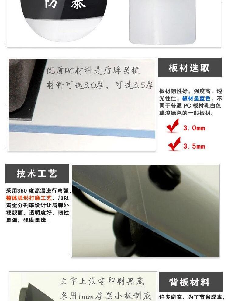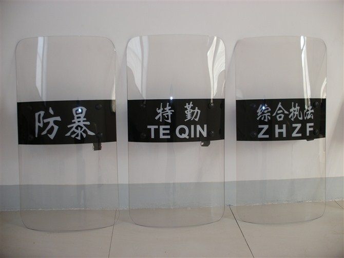 防暴盾牌系列产品采用优质PC材料,具有透 明高,重量轻,抗冲击力强坚固耐用,能抵御除枪炮之外的投掷物和尖税器械、酸类的袭击,防护能力强,安装固定牢靠,操作方便,是执法人员执行任务时的优良 防护装备,经检测符合Q/WHJI16-2002《防暴盾牌》、GA422-2003《防暴盾牌》标准。
