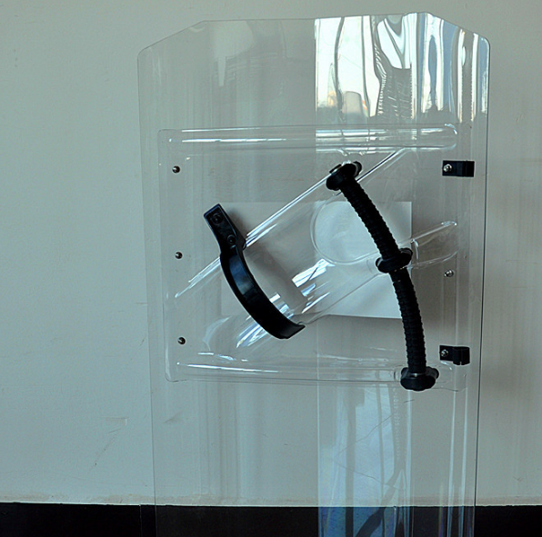 5, 构造:盾板加背板。盾体表面光滑,两侧折翼设计,能多角度有效阻碍危险物的袭击,双层板面设计,背板根据人体结构设计,双把手握把,操作简单便捷且安全有效。