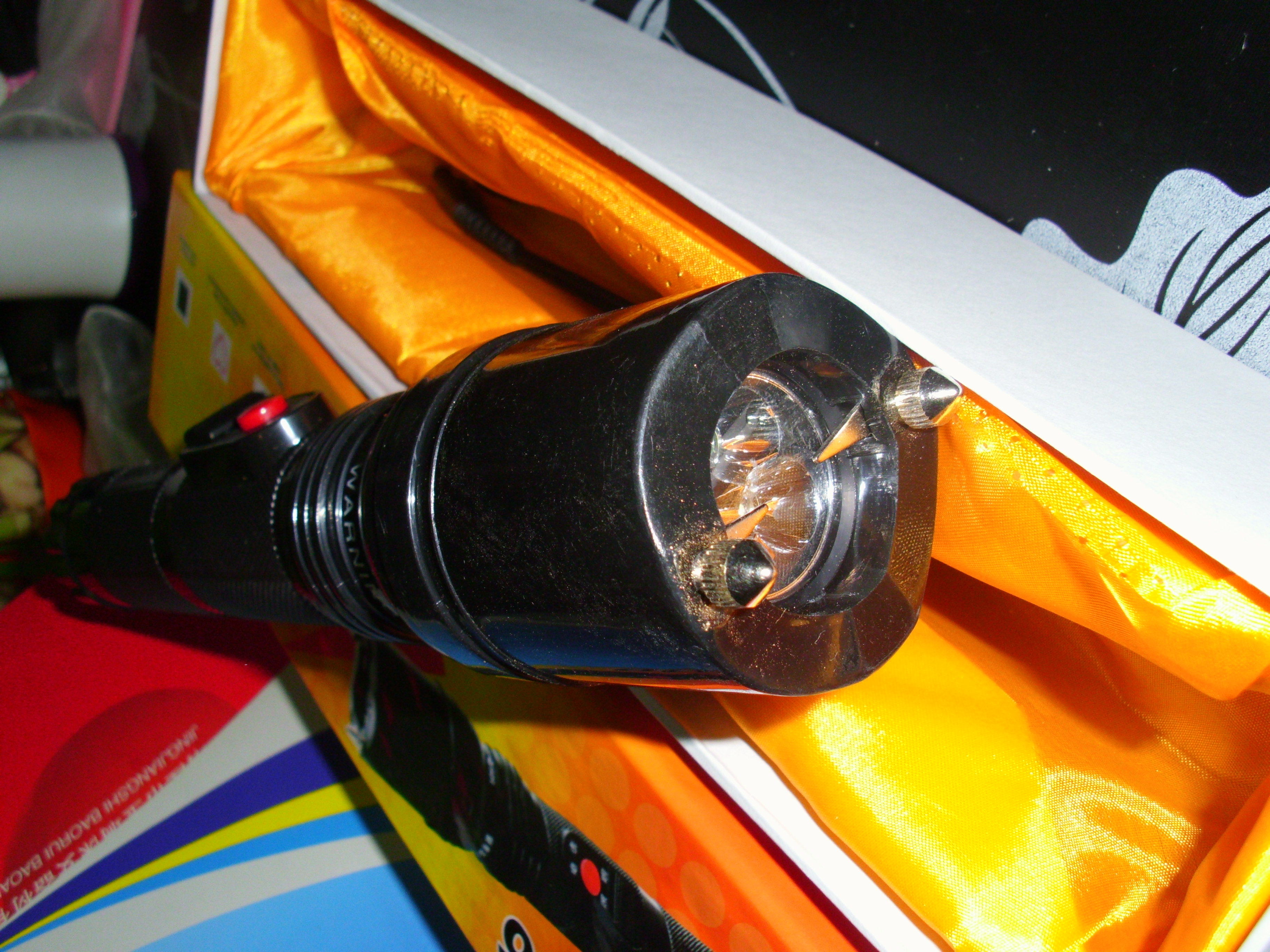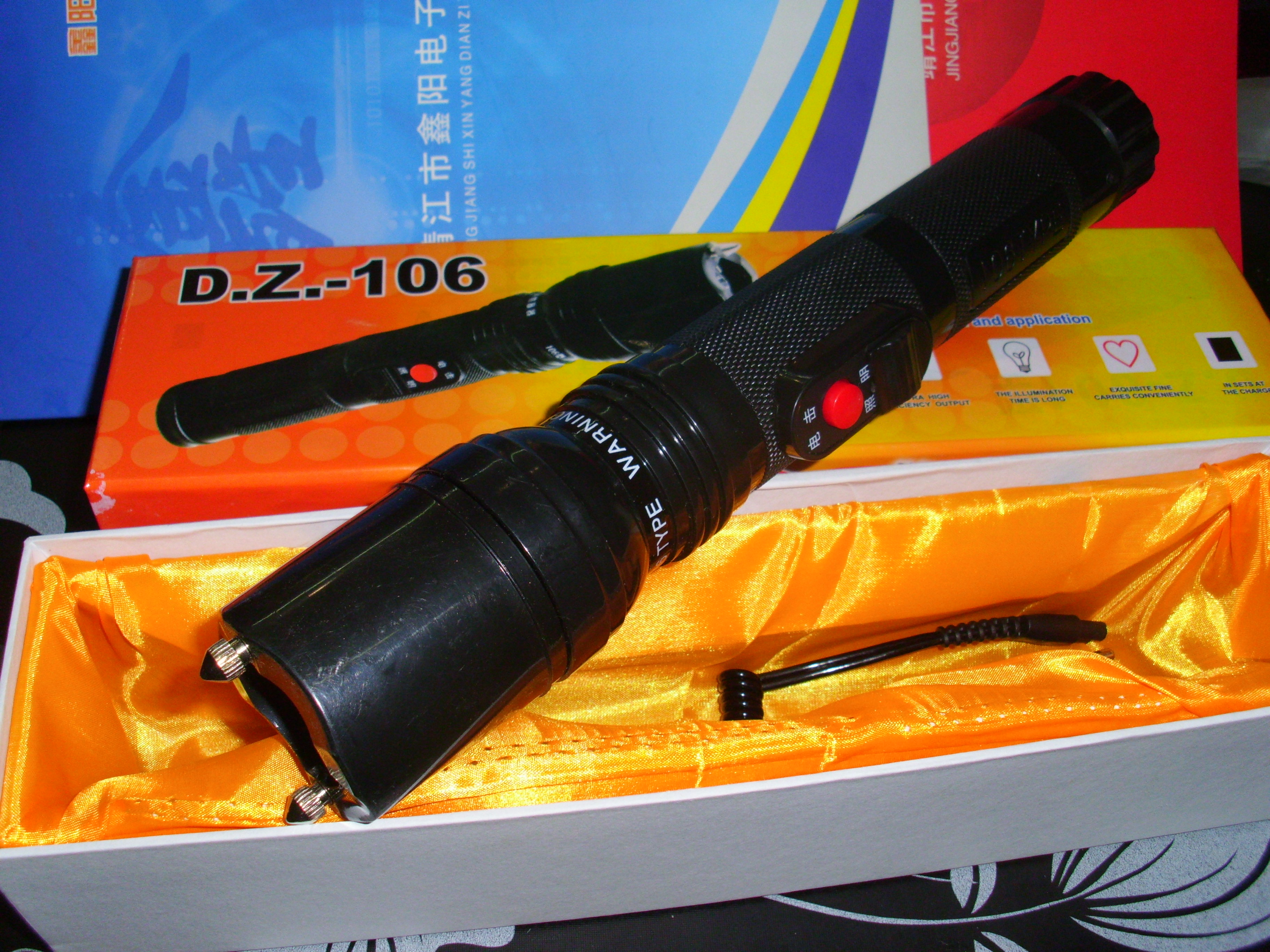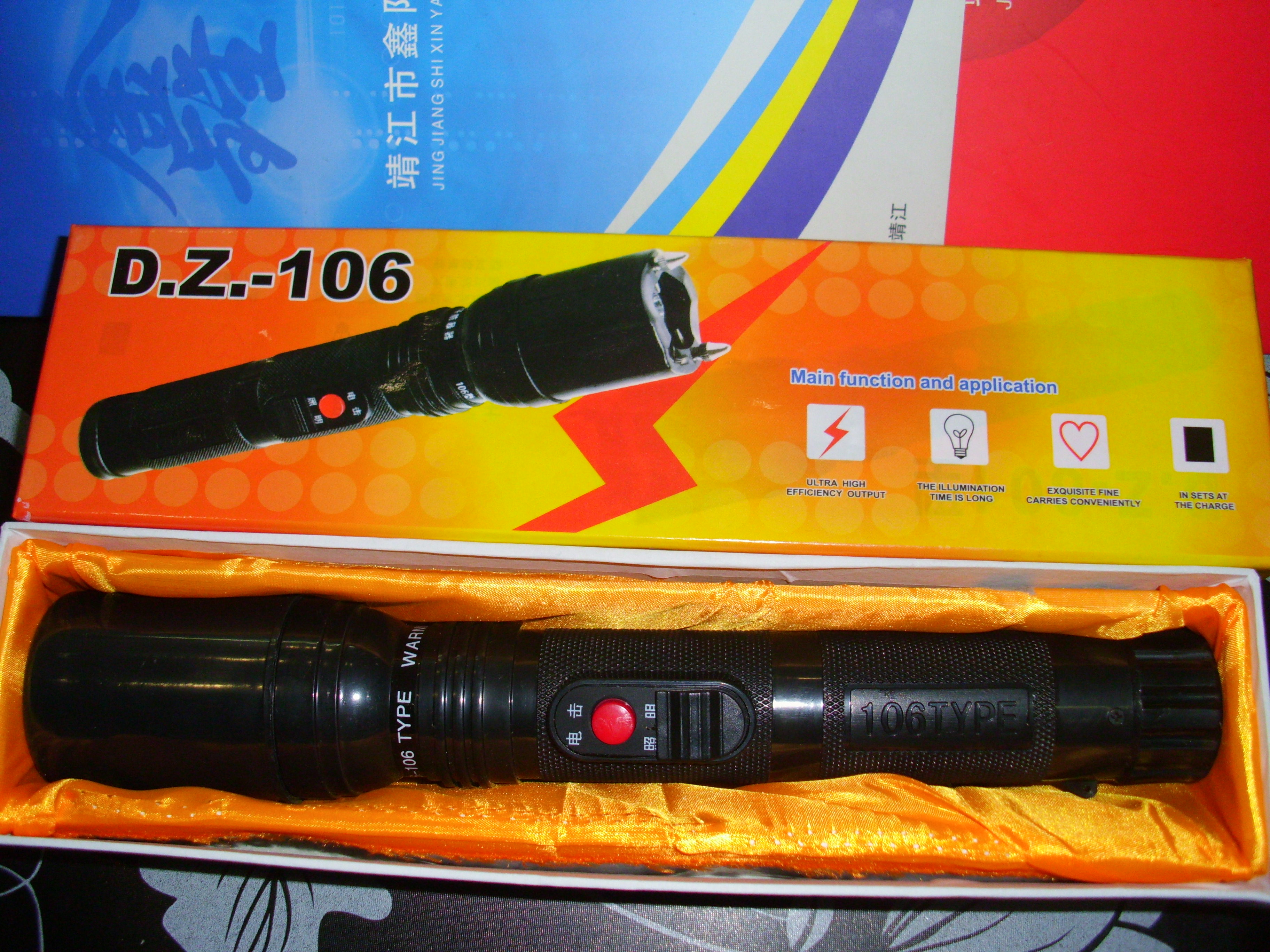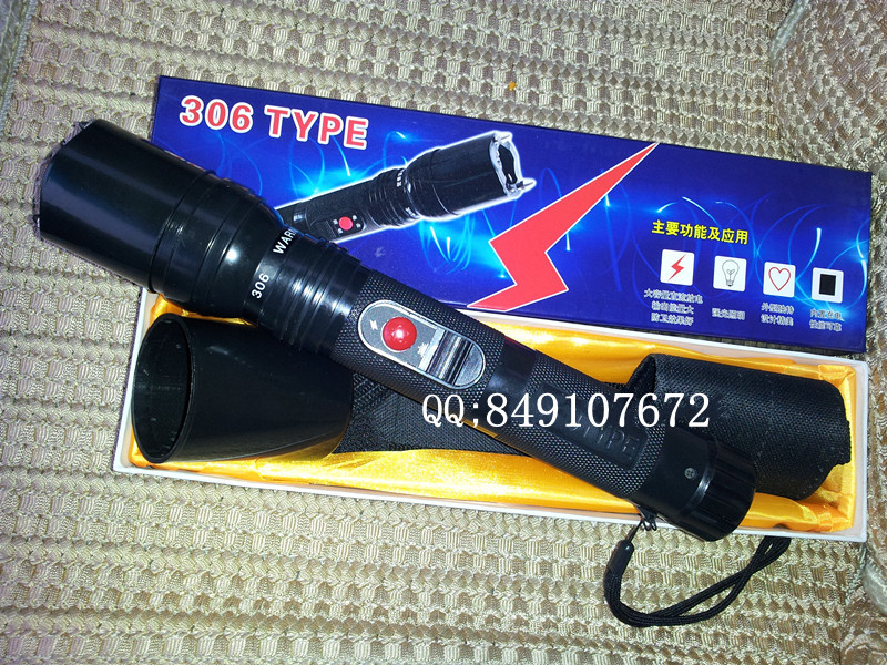 塑料外壳,强光电泡,脉冲高压电击,可充电池内置,线充充电。尾部带有保险开关。尺寸:36mm/260mm。