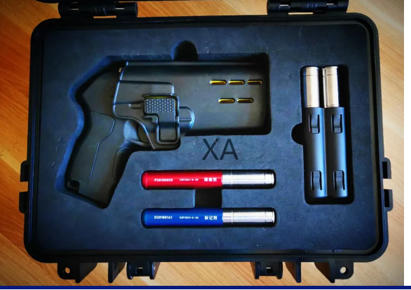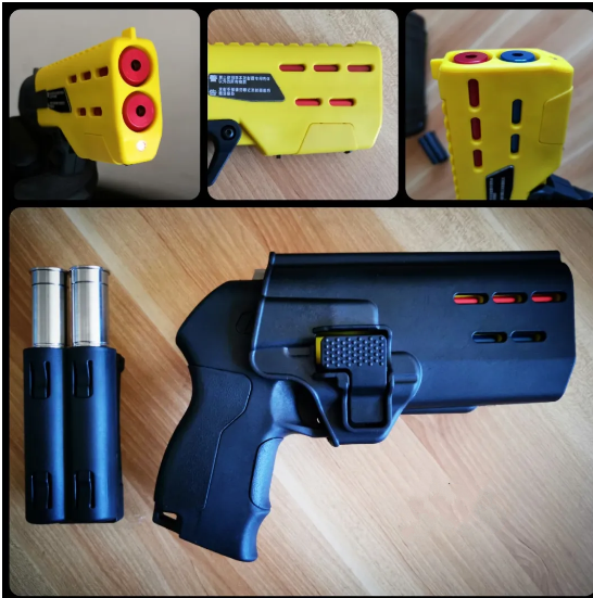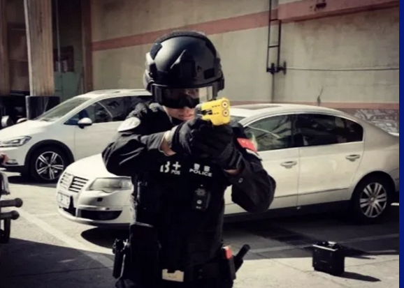 拔出发射器,主体为黄色,表现其非致命性武器的属性,减少警方武力升级的风险。