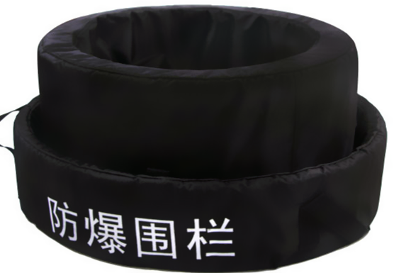 防爆毯外围栏尺寸:150×600(mm),其中高度为150mm,内径为600mm,其防护层结构由内至外依次为14mm厚高性能聚乙烯纤维无纬布与高强涤纶布的混合缠绕层+5mm厚高性能聚乙烯纤维无纬布,重量为4.88KG